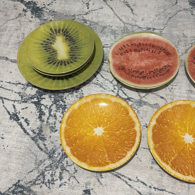 Portakal, kivi ve karpuz dilimi şeklinde tasarlanmış, canlı renklerde tabak seti. Her tabakta meyve dokusunu andıran renkli desenler bulunur. Her meyve tabağından 2 adet. Büyük tabak ölçüsünü belirtmek için örnek