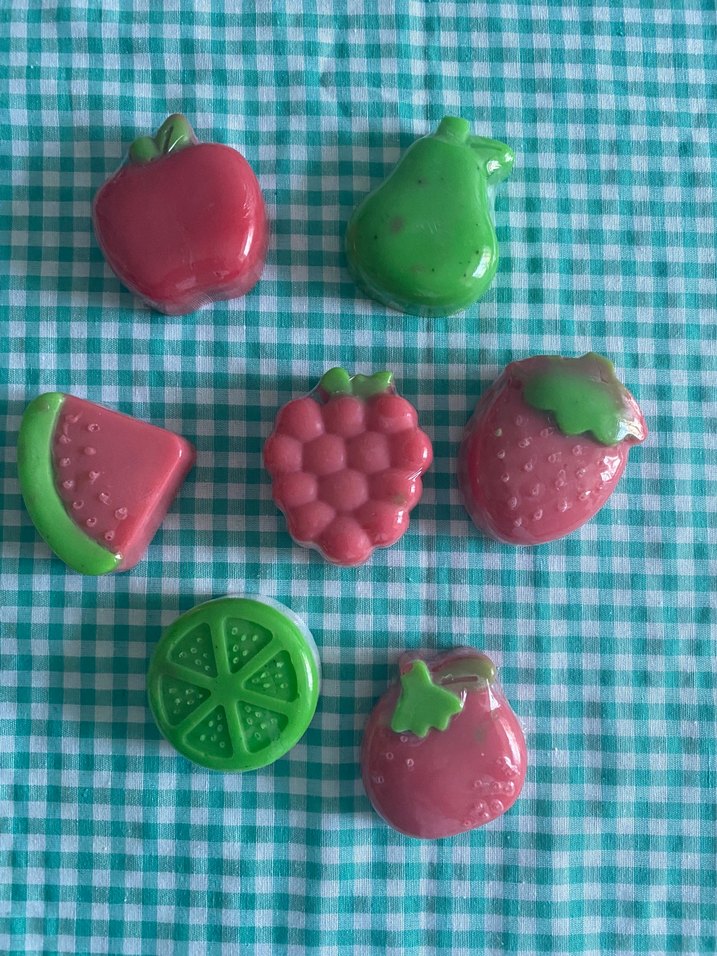 Elma, armut, karpuz, ahududu, çilek ve lime dilimi şeklinde renkli meyve sabunları seti. Banyonuzda eğlenceli bir dokunuş sağlar.