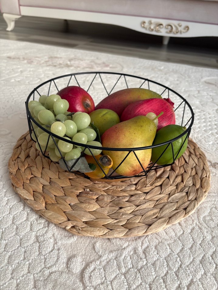 Geometrik tasarımlı koyu renk metal meyve sepeti, çeşitli meyvelerle dolu. Hasır altlık üzerinde şık ve kullanışlı.