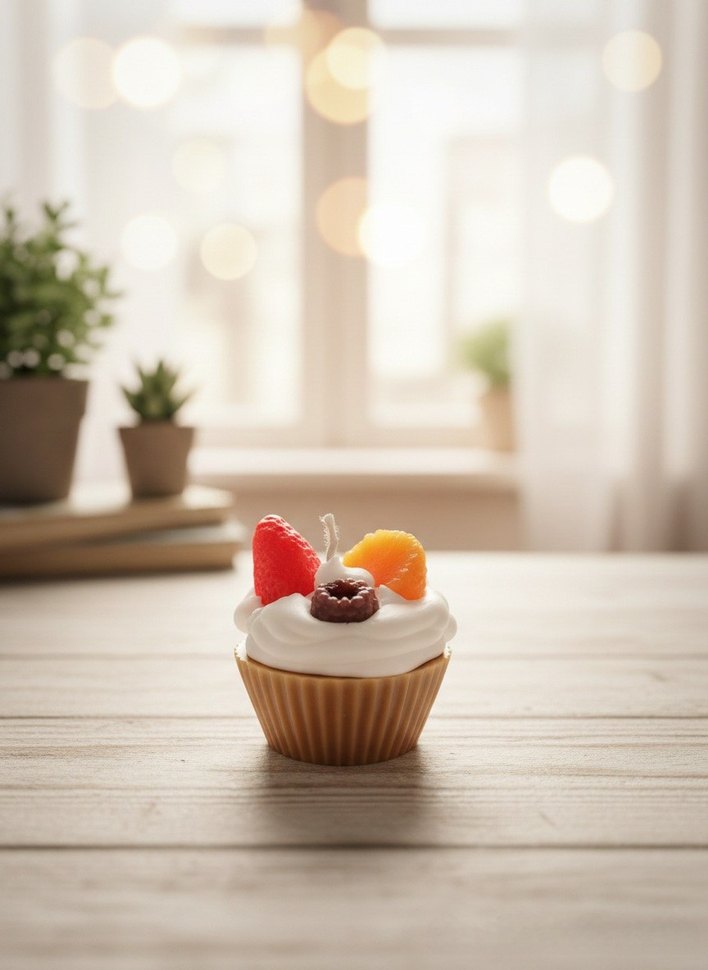 Meyveli ve beyaz kremalı cupcake şeklinde renkli mumluk, ortamınıza neşeli bir hava katar. ️