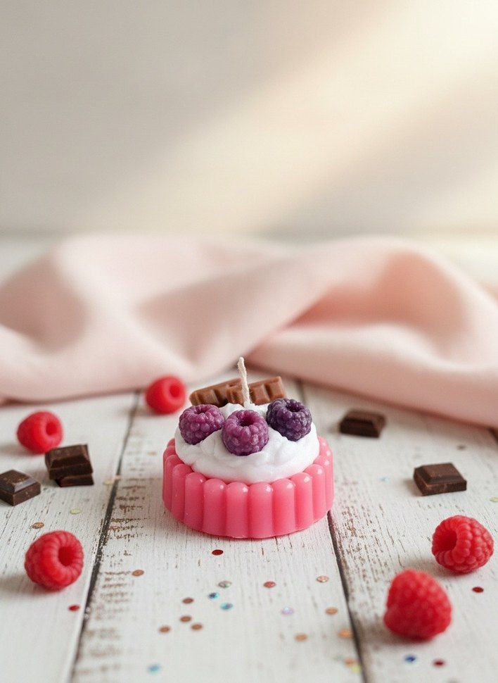 Meyve ve çikolata parçalarıyla süslenmiş, renkli dokunuş katan pembe dekoratif mum ️.