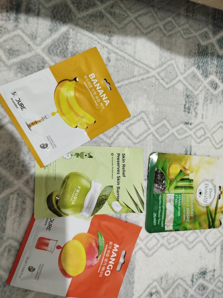 Muz, mango ve cilt rahatlatıcı özellikli kadın yüz maskeleri seti, nemlendirme ve cilt bakımı sağlar.