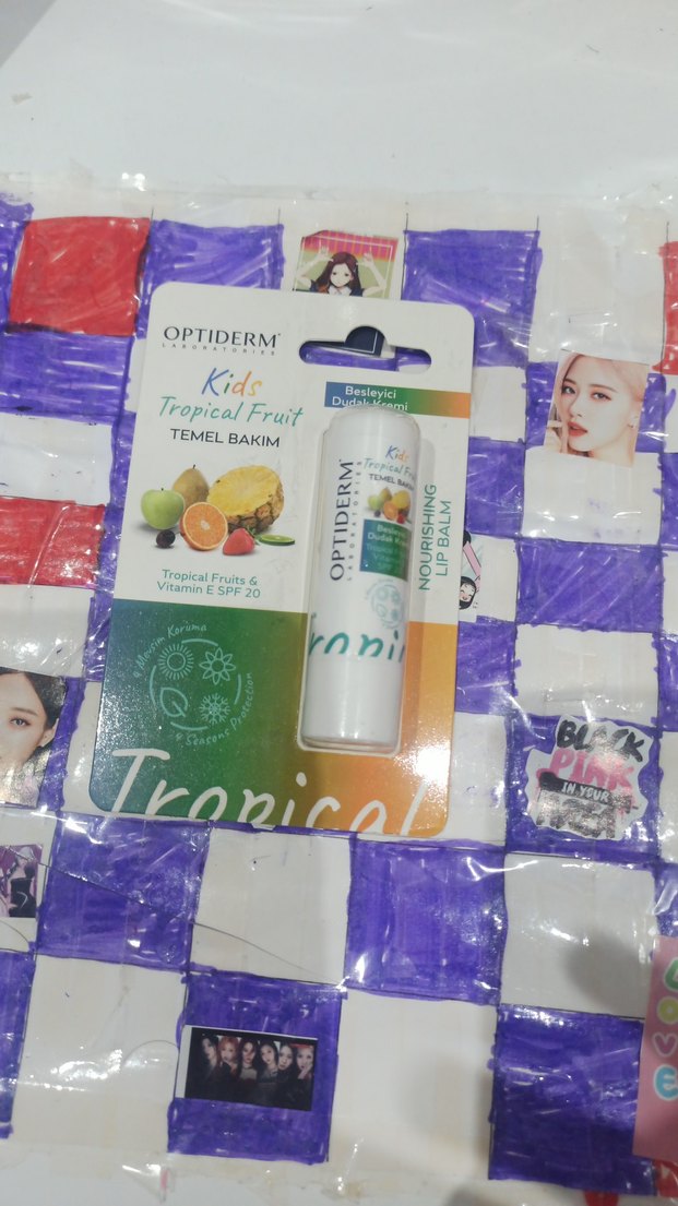 Optiderm Kids Tropikal Meyveli dudak balmı, tropikal meyve özleri, E vitamini ve SPF 20 ile dudakları besler ve korur.