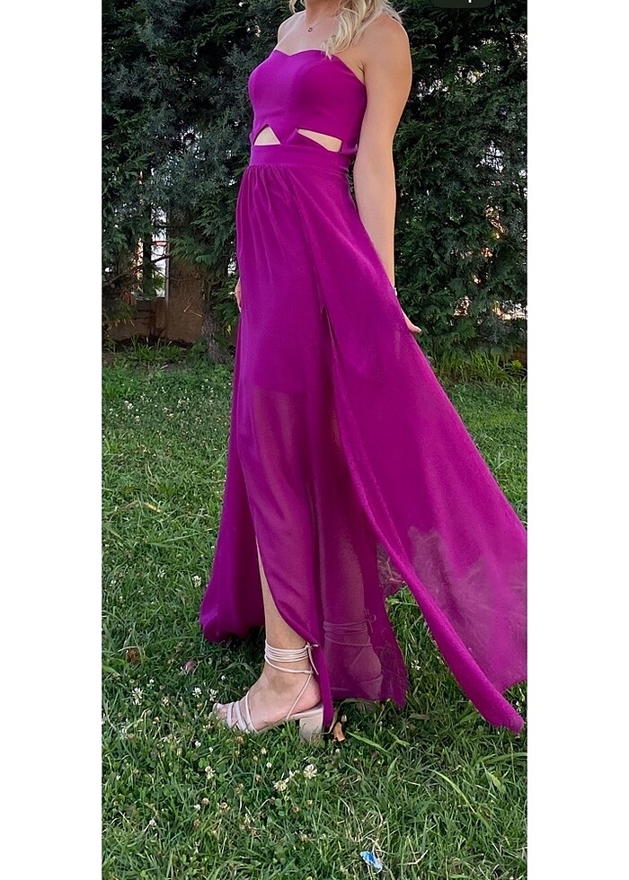 Şifon kumaş 34-36 uyumlu. Hiç bir sorunu yok. Aynı renkte ince askıları da var. İster straplez ister askılı kullanımlı