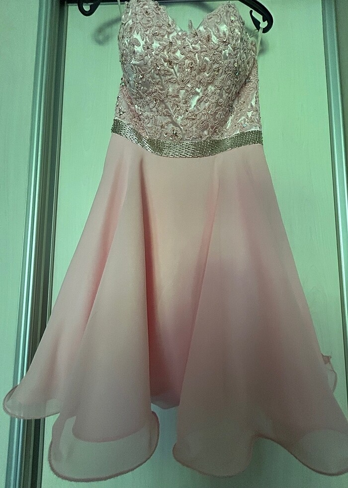 Straples, şeker pembesi, göğüs kısmı boncuk-payet işlemeli Belden etek uzunluğu 50 cm