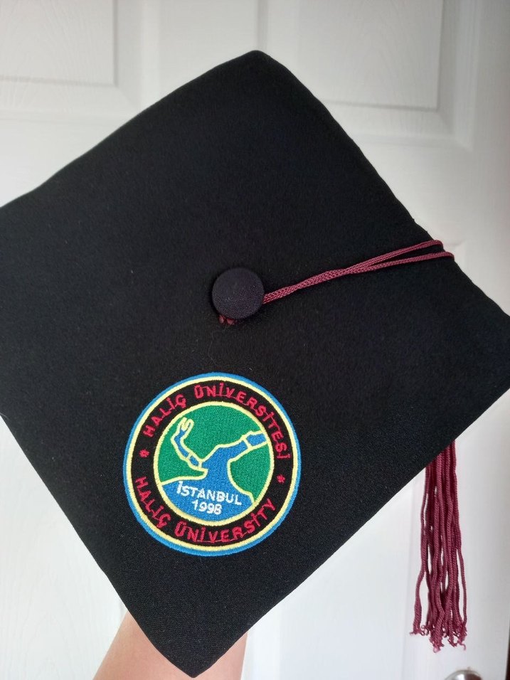 Püsküllü mezuniyet kepi. Üzerinde 1998 tarihli Haliç Üniversitesi logosu bulunan baskılı detay mevcut.