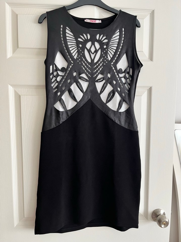 Üst kısmı deri lazer kesim bele oturan elbise. Deformesi yoktur.
