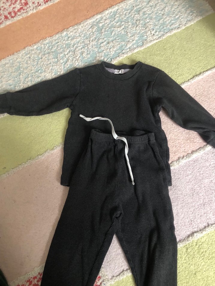 Hem kız hem erkek çocuk için triko dokulu, %100 pamuk koyu gri renkli, bol kesim, sweatshirt ve bağcıklı eşofman altı takımı. Mia baby orta kalınlıkta çok kullanışlı takım. Ayrıca kadife yeşil pantolon da yanında hediye verilecektir. Dizinde giyince belli olmayan minik bir defo vardır fotoda belirtilmiştir.