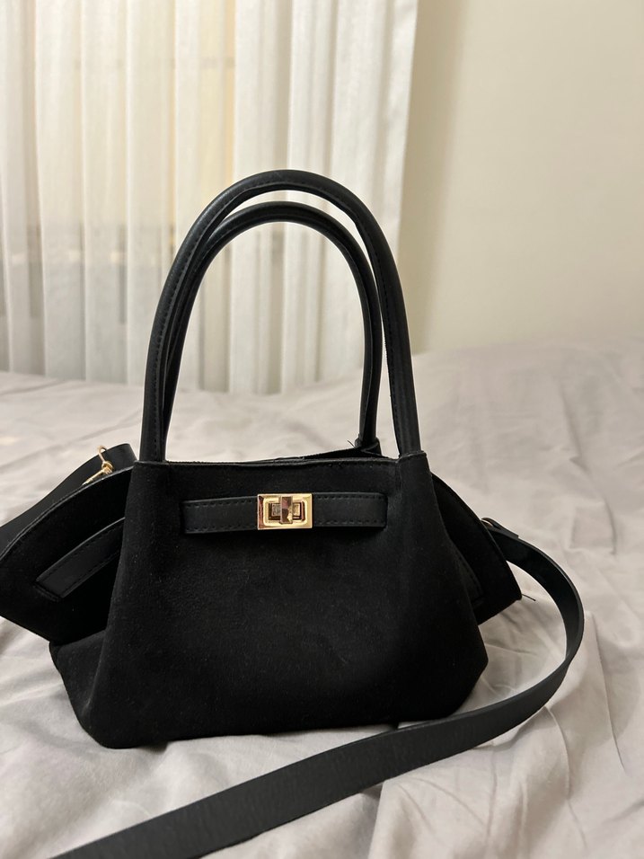 Siyah süet tokalı kadın çantası, modern klasik tarzda ve günlük kullanıma uygun. Koyu renkli, desensiz ve Paris tarzı şıklık sunar. Mia Collection instagram sayfasından alındı. hiç kullanılmadı