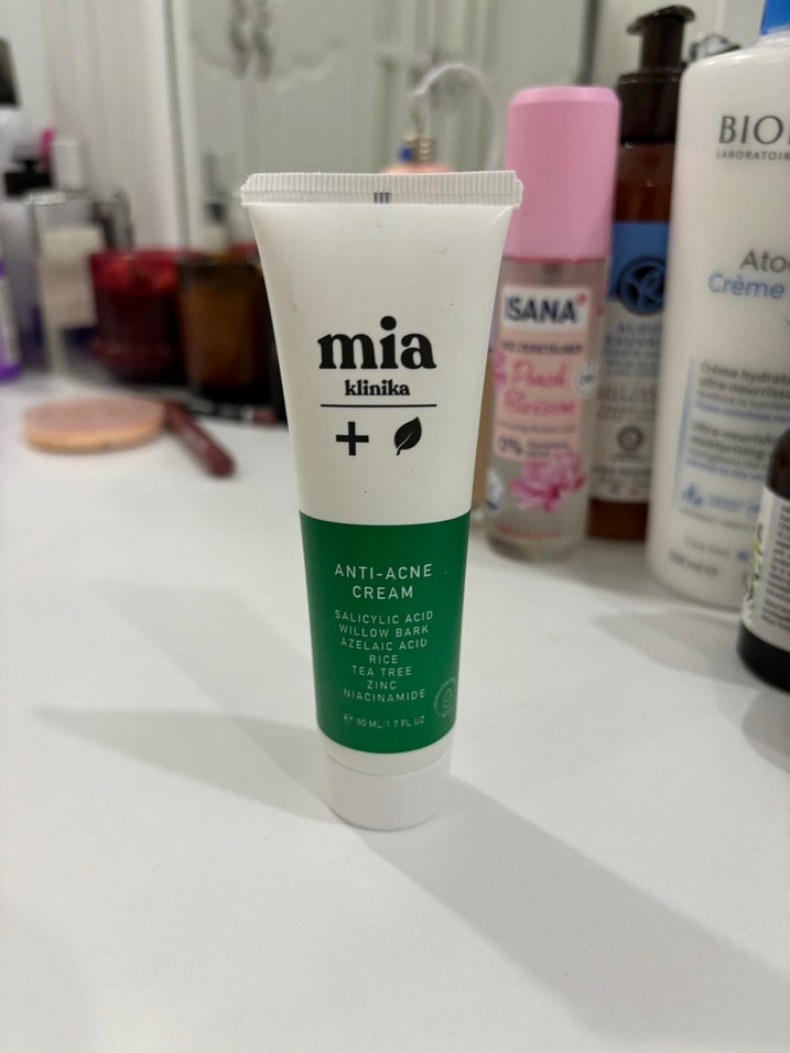 Mia Klinika anti-akne krem, salisilik asit, azelaik asit, pirinç özü, çay ağacı yağı ve niasinamid içerir, yağlı cildi temizler ve yatıştırır.