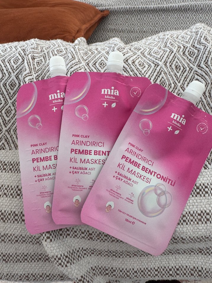 Mia Pembe Bentonit Kil Maskesi, salisilik asit ve çay ağacı özlü, cildi derinlemesine arındırır. 150 ml ambalajda sunulur. ♀️