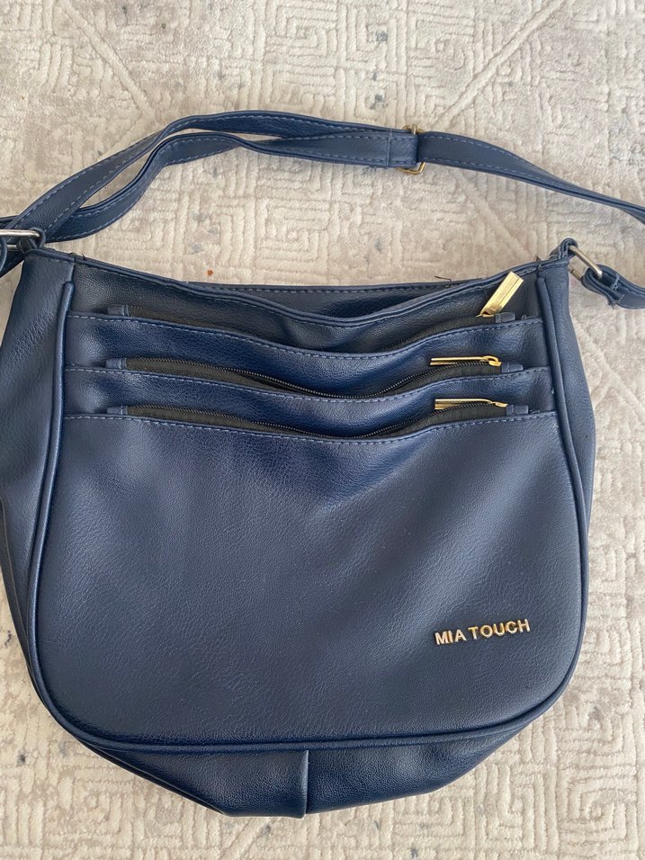 Mia Touch marka mavi deri kadın çanta, çoklu fermuarlı ceplere ve ayarlanabilir askıya sahiptir. Günlük sokak stili için uygundur. Merhaba original deridir hiç kullanılmadı defo yok