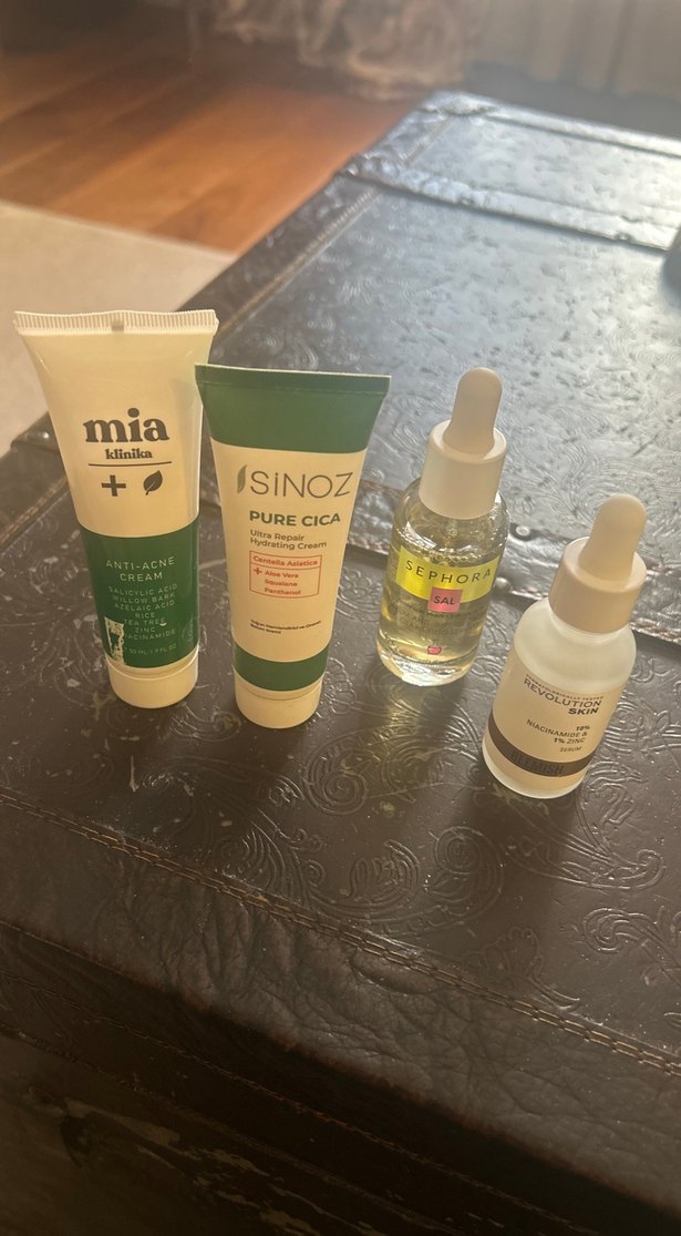 Mia Klinika anti-akne krem ve Isinoz Pure Cica ultra tamir nemlendirici kremler tek kez kullanildi i, sephora salisilik serum iki kez kullanildi, revolution niacinamde iki kez kullanildi