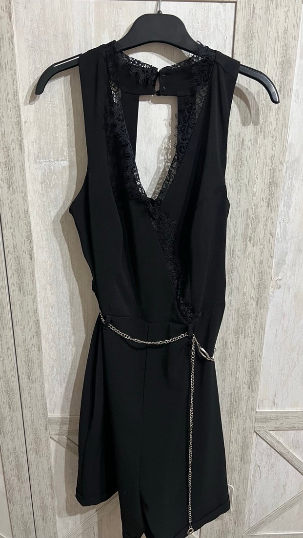 V yaka, kolsuz ve metal kemerli mini siyah tulum, üst kısmında dantel detaylara sahiptir. Özel gecelerde şık bir görünüm sunar. Çok kaliteli bir markanın, çok kaliteli bir ürünüdür. Hiçbir defosu yoktur, yalnızca bir kez giyilmiştir.
