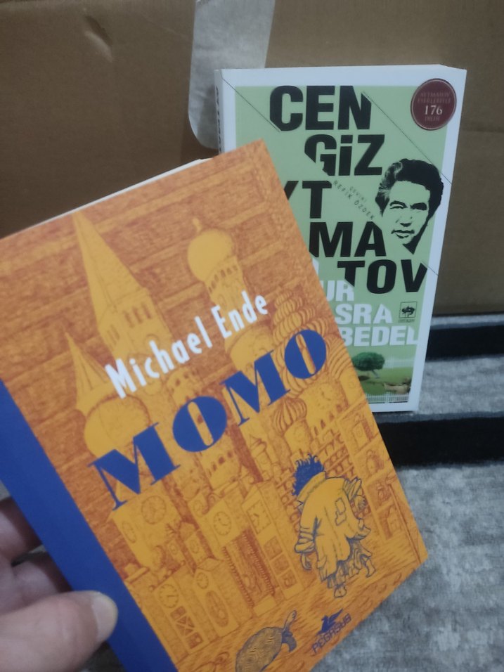 Michael Ende'nin "Momo" romanı, turuncu ve mavi renklerle illüstrasyonlu kapak tasarımına sahiptir.Cengiz aytmatov'dan Gün olur asra bedel kitabı... iki kitap fiyatıdır!
