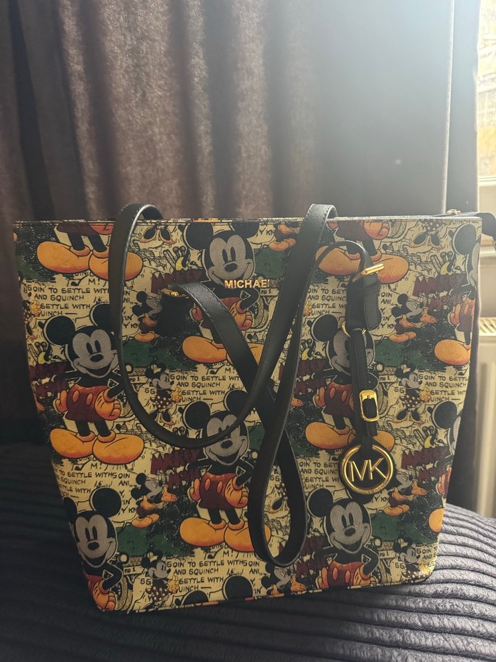 Michael Kors baskılı deri çanta, koyu çok renkli vintage pop kültür desenli. Tokalı askılarıyla günlük kullanıma uygun.