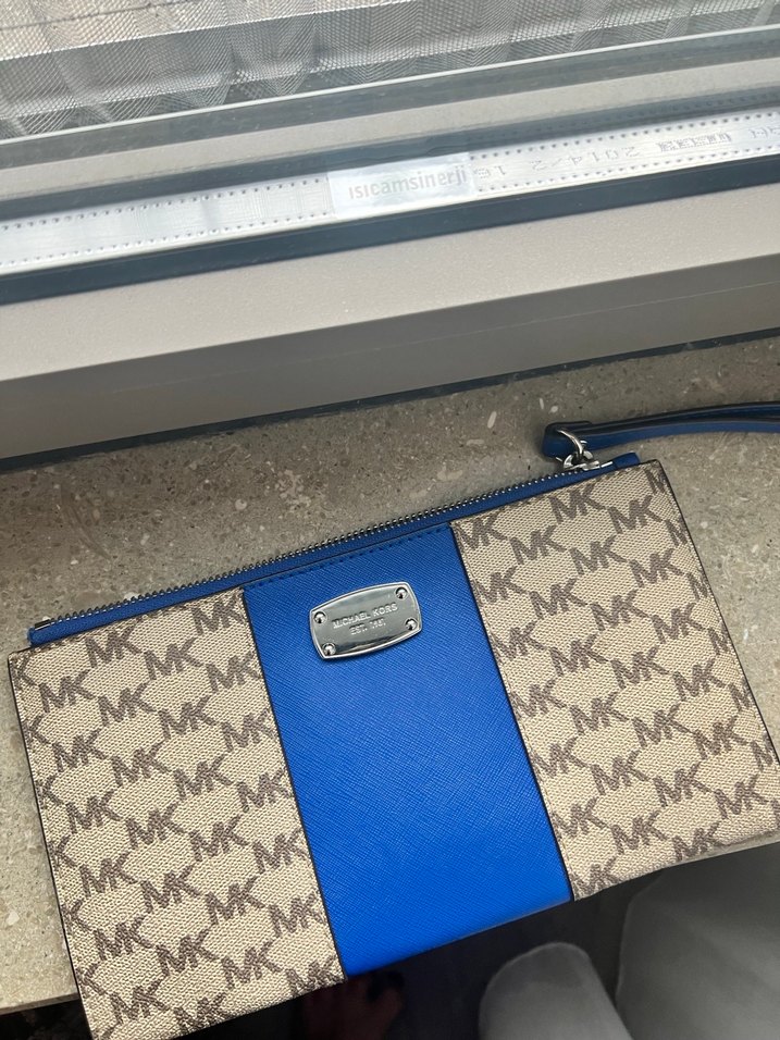 Michael Kors baskılı ve mavi deri panelleri birleştiren fermuarlı kadın cüzdanı, günlük kullanım için uygun ve trend rahat tarzda. Orijinal