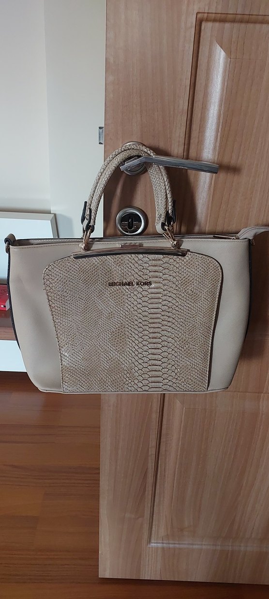 Michael Kors imzalı, bej deri yılan desenli ve tokalı saplara sahip kadın çantası. Klasik zarafeti çağdaş tarzla birleştirir. yurtdisindan geldi