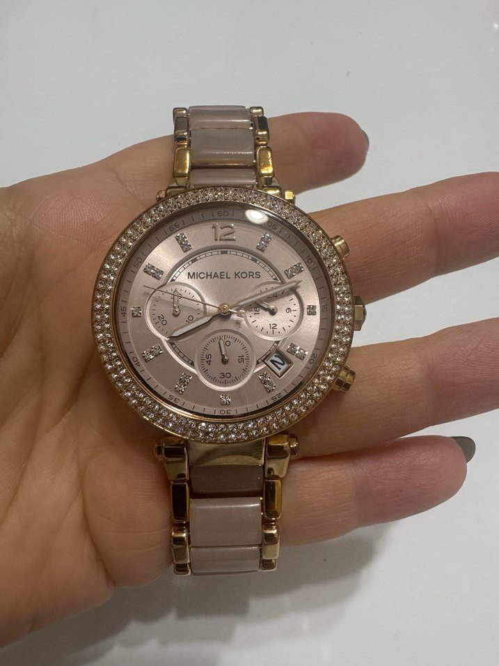 Michael Kors MK5896 Kadin Kol Saati. Kasa çapi 39mm. Kordondaki toz pembe alan ilk alimdaki gibi parlak degil. Ama higbir sikintisi yok. Ekim ayinda akasya avm saat ve saat'de pilini degistirdim. Suanki sezon fiyati 24.310 TL