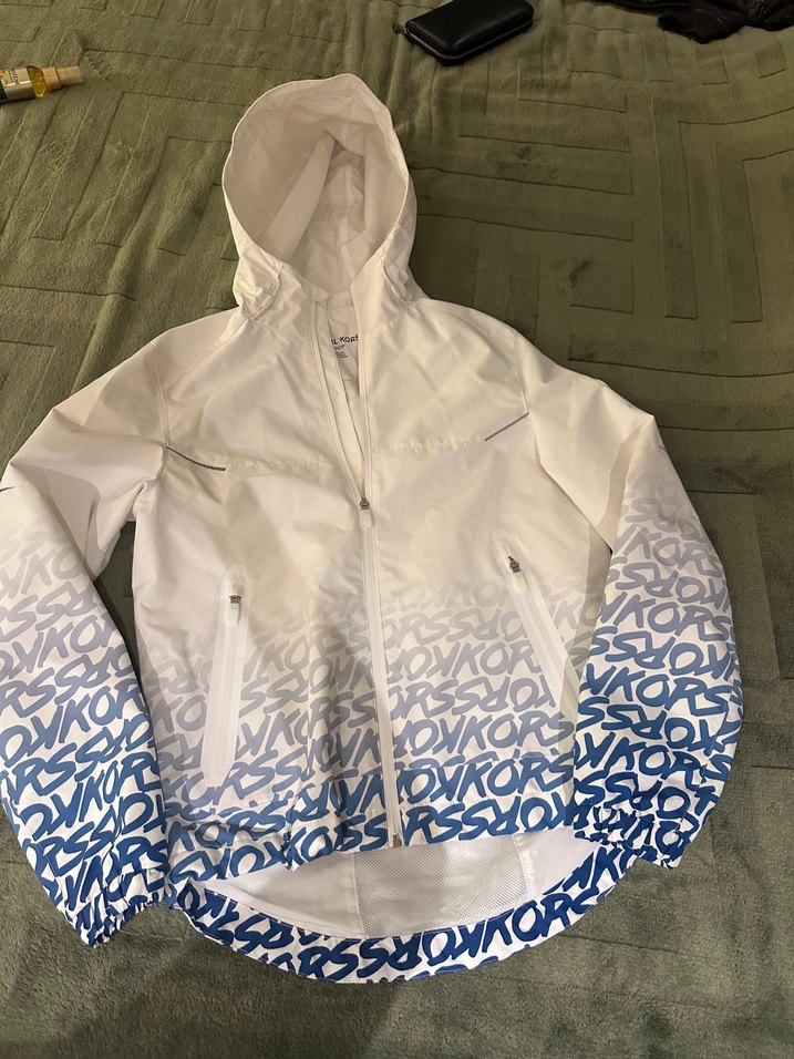 Kapüşonlu, fermuarlı ve baskılı kolları ile ucu mavi tonlarda olan, sentetik kumaştan üretilmiş, normal kesim beyaz kadın ceketi. Michael Kors kendi mağazasından almıştım. XS yazıyor ama rahat kalıp S olarak ekledim tertemiz