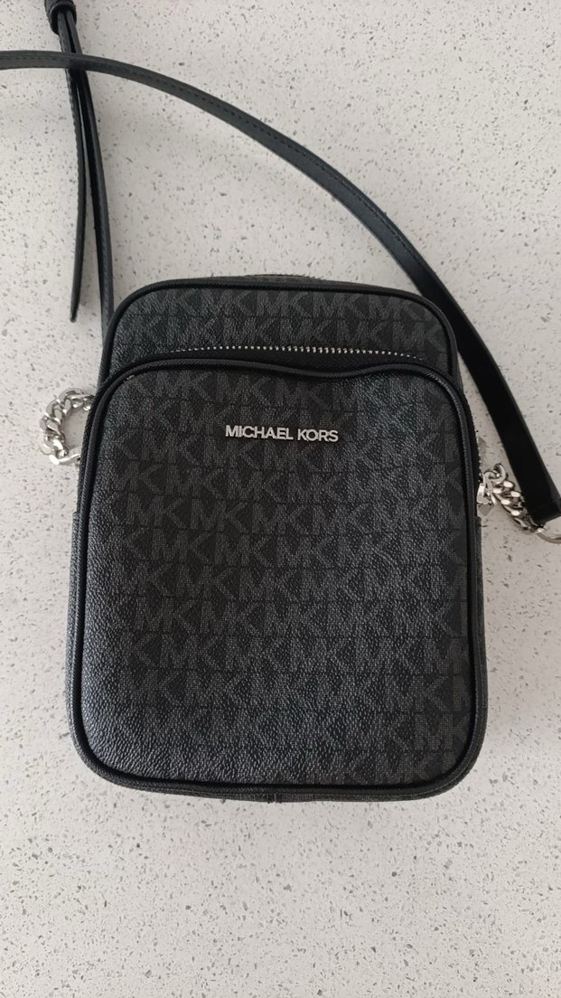 Michael Kors markalı, baskılı gri deri çapraz çanta, tokalı detaylı, zincir aksanlı askıya sahip, günlük ve iş stiline uygun şık bir modeldir.