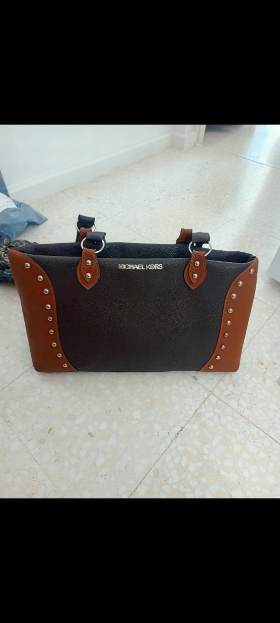 Michael Kors markalı kadın çanta, kahverengi deri, tokalı detaylar ve baskılı desenlerle. Minimalist biker tarzıyla günlük kullanıma uygun.