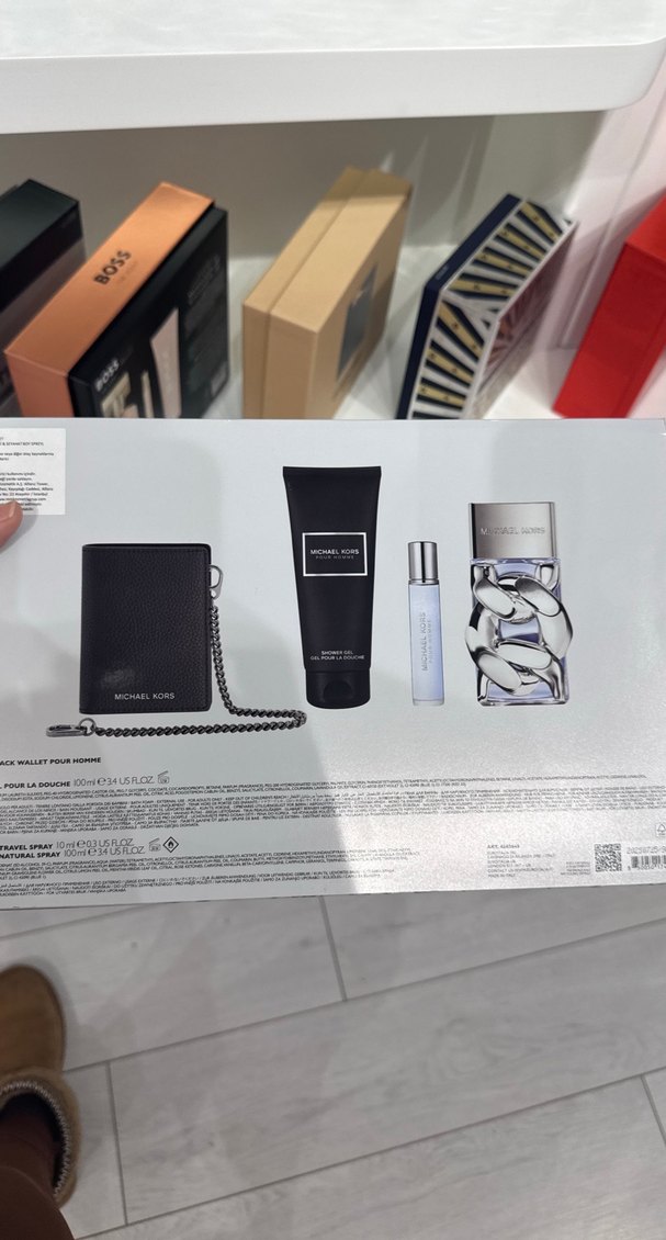 Michael Kors erkek parfüm seti, zincir detaylı gri cüzdan, siyah duş jeli, seyahat spreyi ve zincir tasarımlı parfüm şişesinden oluşur. Minimalist ve çağdaş tarz için ideal.
