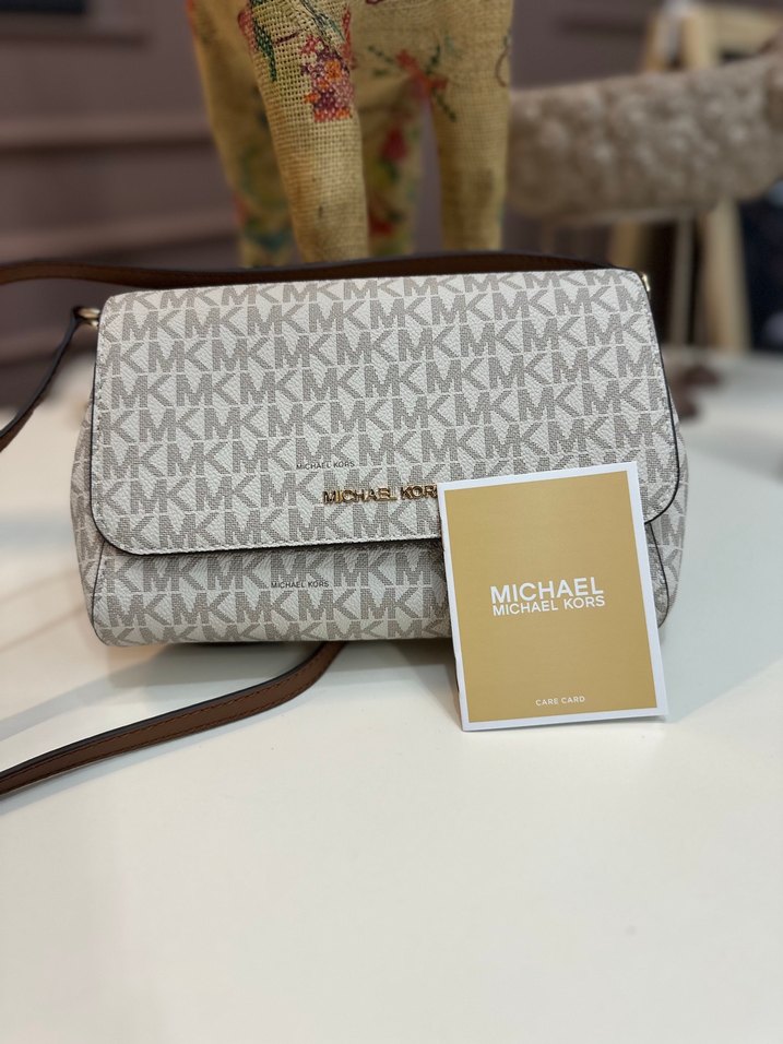 Michael Kors marka, krem baskılı taba detaylı deri, tokalı kapaklı modern klasik tarzda kadın çapraz çanta, günlük kullanıma uygun.