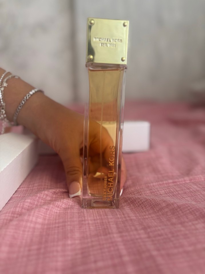 Michael Kors kadın parfümü, şık ve uzun cam şişesi ile altın renk kapaklıdır.