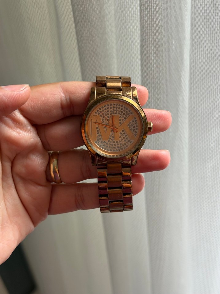 Kadınlar için parlak altın renkli, tokalı ve minimalist tasarımlı kol saati. Kadranda büyük MK logosu bulunur. ⌚ Göründüğü gibidir. Pili bitik. Fiyata yansıttım