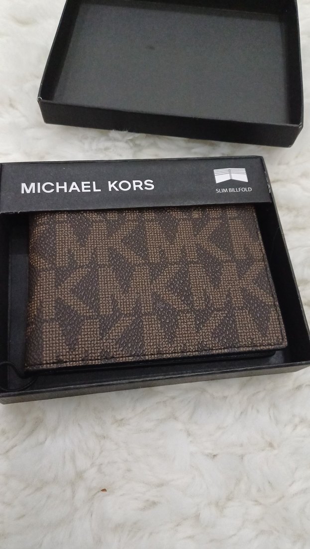 Michael Kors marka, baskılı desene sahip koyu kahverengi deri erkekcüzdan, tasarımıyla modern klasik iş stiline uygundur.