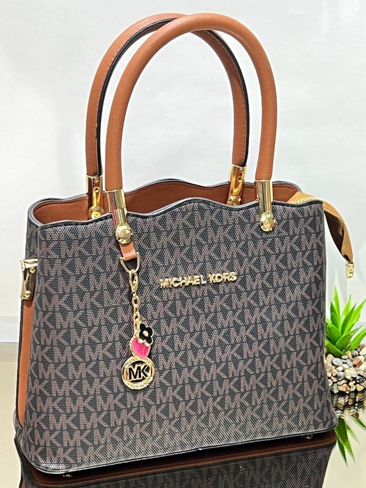 Michael Kors kadın çanta, kahverengi deri saplar ve MK logosu baskılı gri desene sahip. Tokalı detaylar ve dekoratif aksesuar içerir, günlük ve sokak stiline uygun.