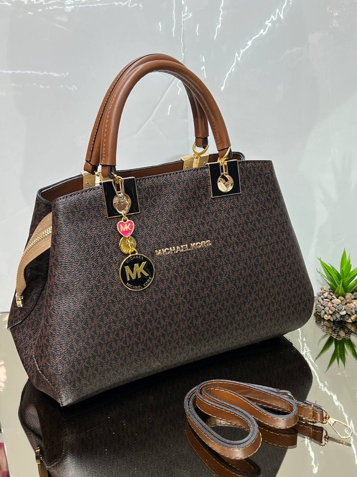 Michael Kors kahverengi deri çanta, baskılı desen ve altın detaylı tokalarla. Çift kulplu ve çıkarılabilir askılı, günlük iş kullanımı için uygundur.