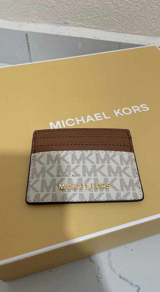 Michael Kors marka, kahverengi deri ve gri baskılı desenli, cırt cırtlı kadın cüzdanı. Trendy casual ve iş stiline uygun, günlük kullanıma ideal. Orijinaldir