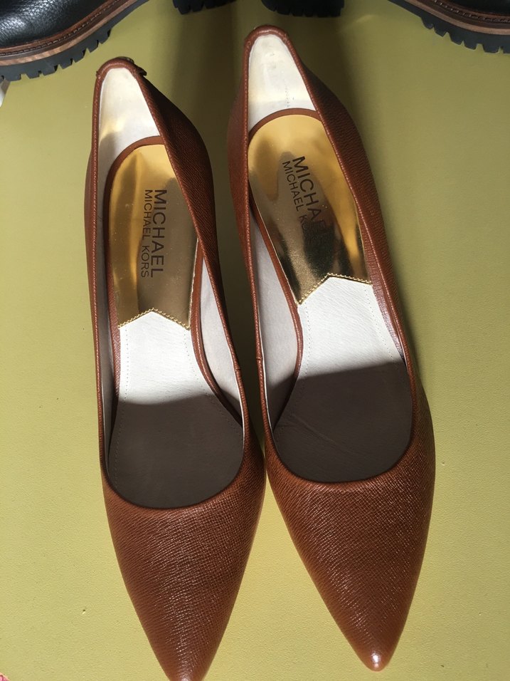 Michael Kors kahverengi deri stilettolar, parlak yüzey ve tokalı detay ile klasik ve modern ofis tarzı için uygundur.