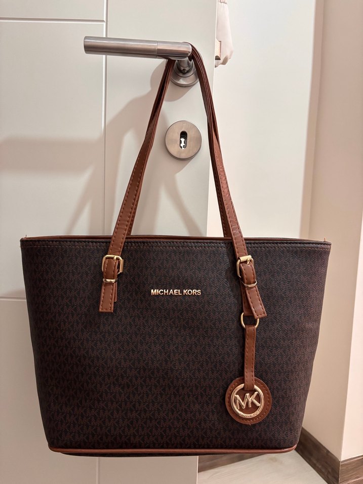 Temiz yeni gibi hiçbir sorunu yoktur.Michael Kors kahverengi deri kadın çanta, parlak baskılı deseni ve tokalı askılarıyla modern klasik stili iş şıklığıyla birleştirir, günlük kullanım için uygundur.