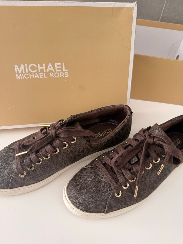 Michael Kors kahverengi kadın spor ayakkabı, parlak kama topuk ve tokalı detaylara sahip, günlük sokak stili için uygun kauçuk tabanlı bir modeldir. İçi biraz aşınmıştır o yüzden fiyat uygun tutulmuştur kutusu var fakat faturası vesaire yok