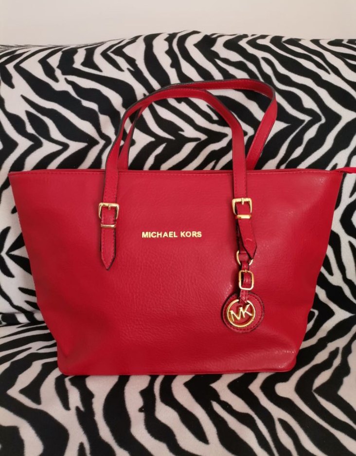 Michael Kors marka kırmızı deri kadın çanta, tokalı askıları ve renkli tasarımıyla dikkat çekiyor. Cesur Paris sokak modasına uygun, günlük kullanıma ideal.