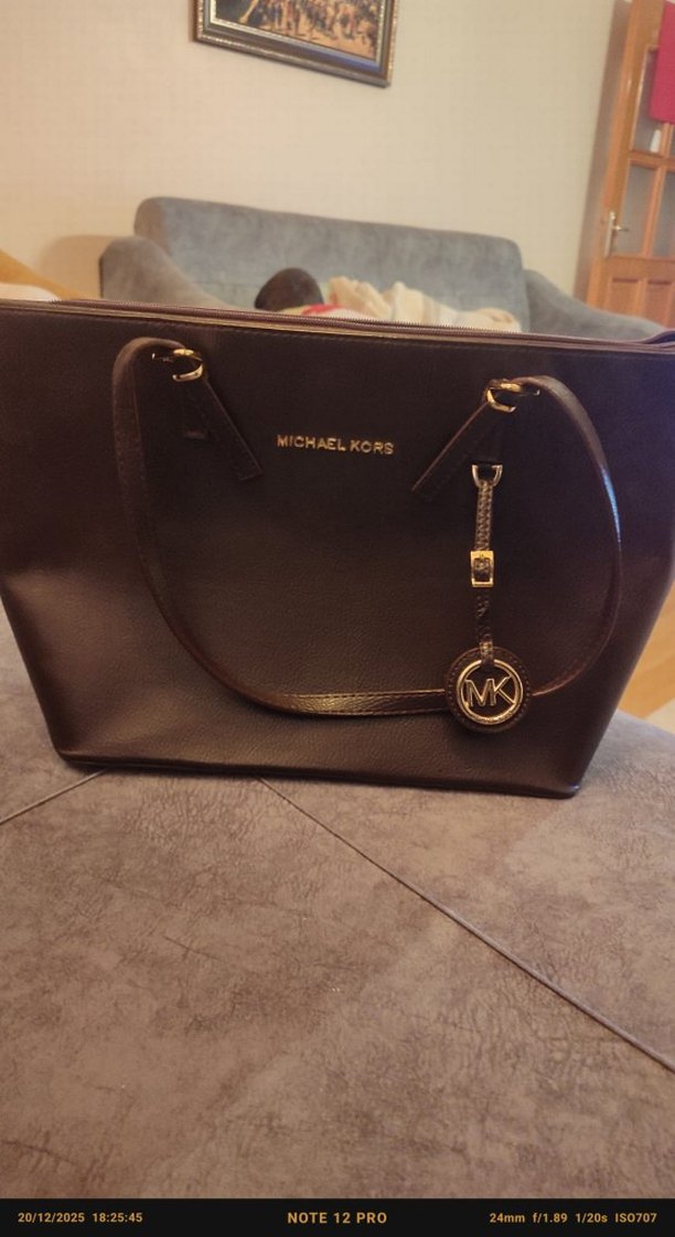 Michael Kors imzalı, tokalı ve baskılı desenli koyu kahverengi deri çanta. Modern klasik tarzıyla iş hayatına ve romantik akşamlara uygun.