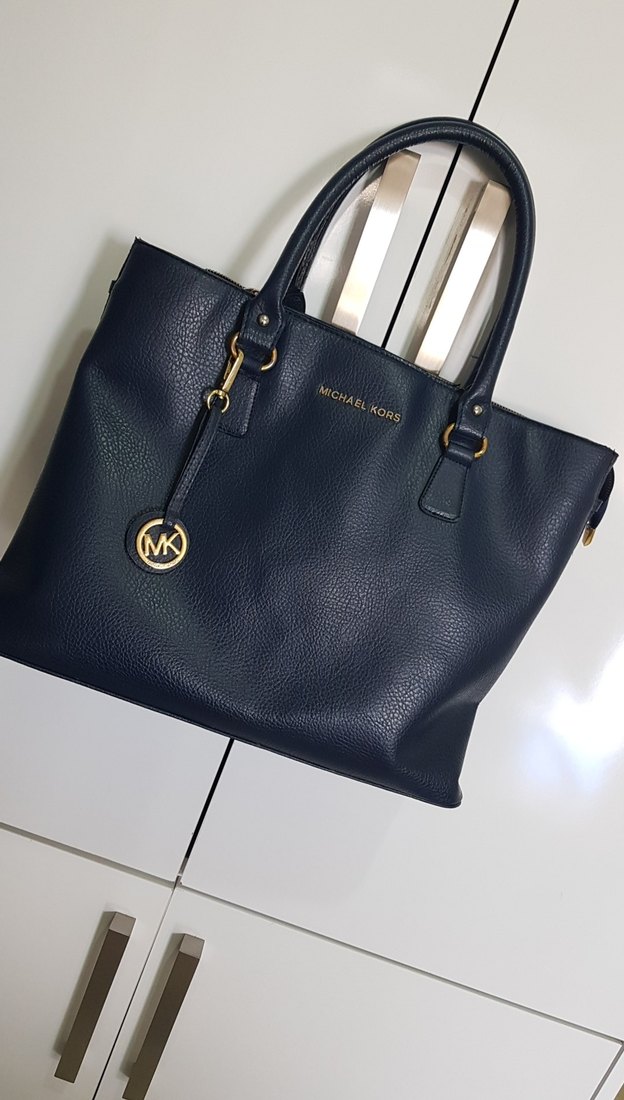 Michael Kors'ün parlak mavi deri çantası, tokalı tasarımı ve modern klasik stiliyle ofis kullanımına uygundur. Baskılı deseni ve sağlam sapları vardır.