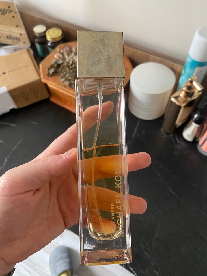 michael kors parfüm seks amber kadın parfümü, altın kapaklı şeffaf dikdörtgen şişede, amber renkli koku içerir.