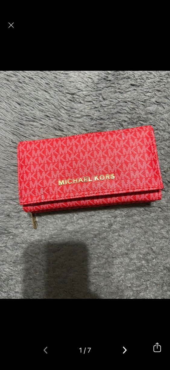Kırmızı renkli, renkli baskılı ve fermuarlı Michael Kors kadın cüzdanı, modern klasik tarzı ve rahat havasıyla günlük kullanıma uygun. İthal üründür. hediye heldi hiç kullanılmamıştır