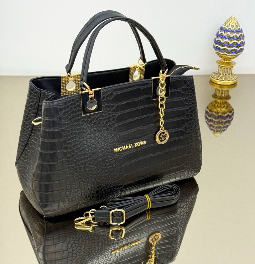 Michael Kors imzalı, parlak yılan derisi desenli siyah deri çanta. Tokalı askılar ve altın detaylarla modern klasik tarzda, günlük kullanıma uygun.
