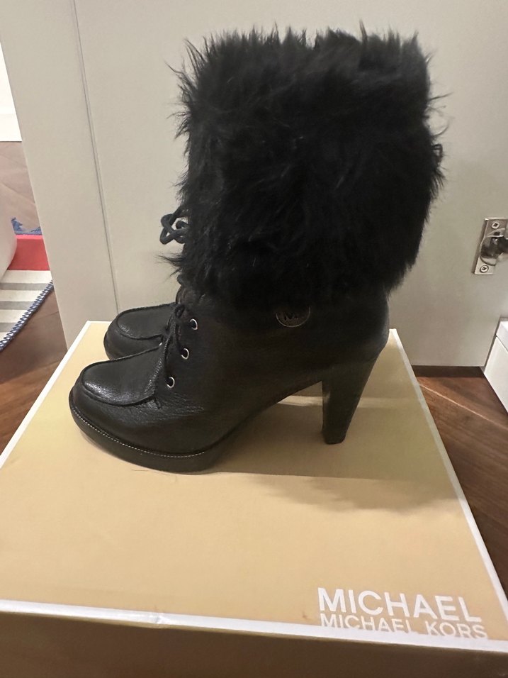Michael Kors marka, siyah deri, kürklü yüksek topuklu botlar, cesur gotik tarzda, ofis kullanımı için uygun. Kürk kısmı açılıp uzun çizme olarak da kullanılabilir gerçek deri
