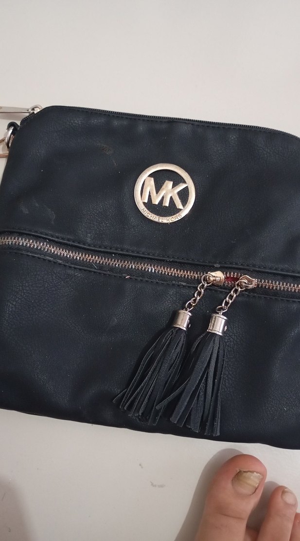 Michael Kors marka siyah parlak deri çanta, baskılı detaylar ve püsküllerle süslenmiş, günlük sokak tarzına uygun.