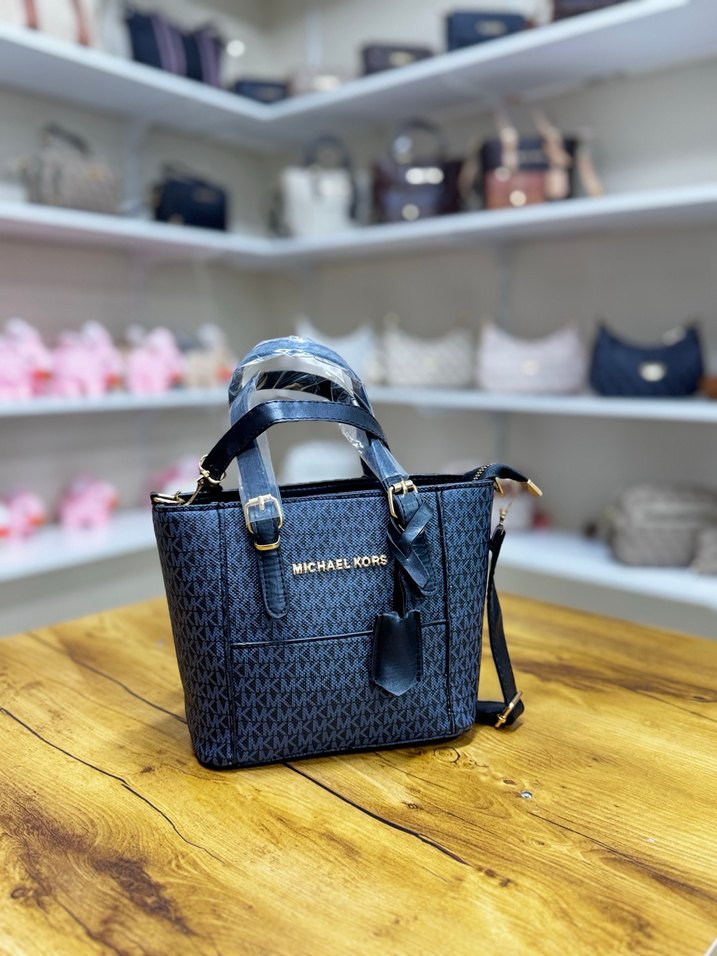 Michael Kors marka, siyah desenli deriden yapılmış, tokalı saplara sahip, günlük sokak stili için uygun kadın çantası.