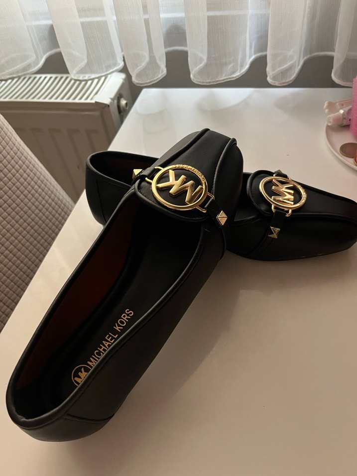 Michael Kors siyah kadın loafer ayakkabılar, tokalı ve blok topukludur. Kauçuk malzemeden yapılmış, klasik şıklık ve sokak tarzını birleştirir.