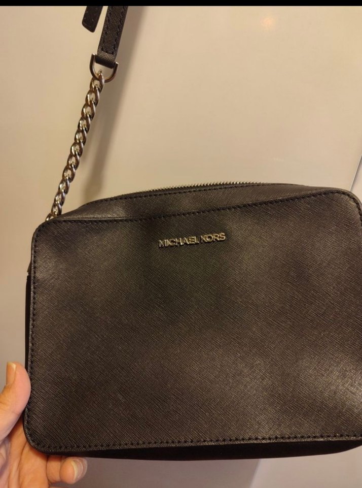Zincir detaylı, koyu kahverengi deri çapraz çanta. Minimalist ve günlük kullanıma uygun sade tasarım. Marka: Michael Kors.