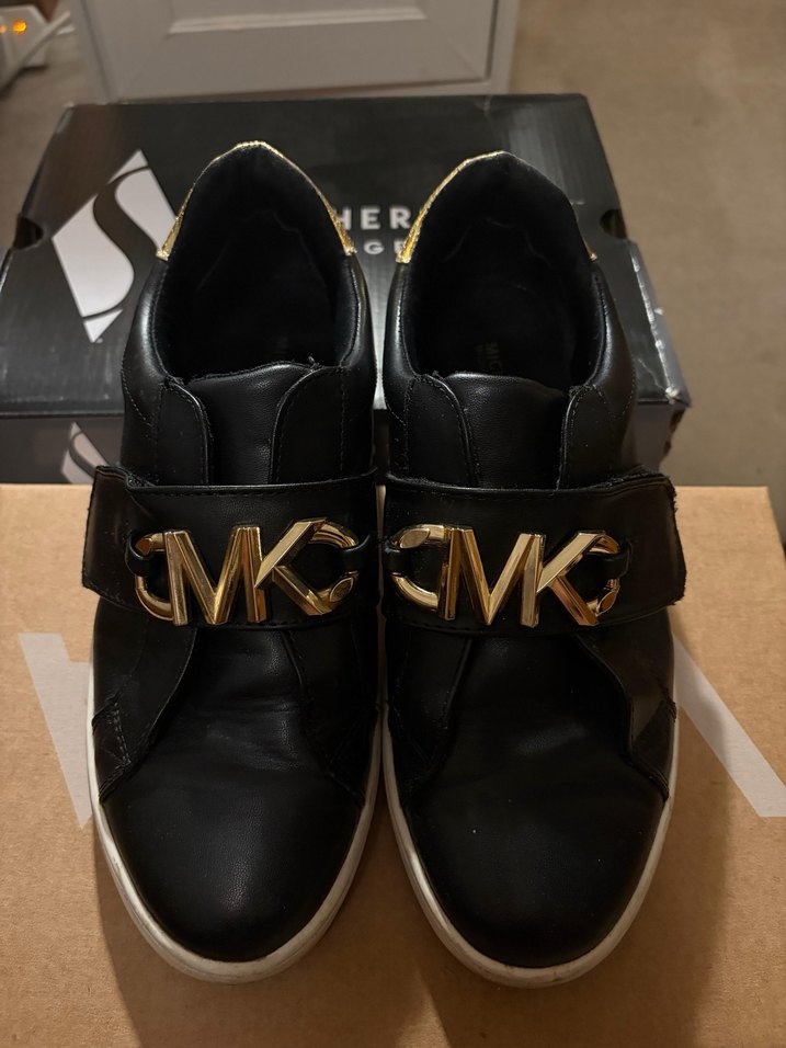 Siyah sokak stili sneakers, parlak altın tokası ve stiletto topuklu, kauçuk tabanlıdır. Günlük kullanıma uygun, desensiz ve trend casual tarzda.