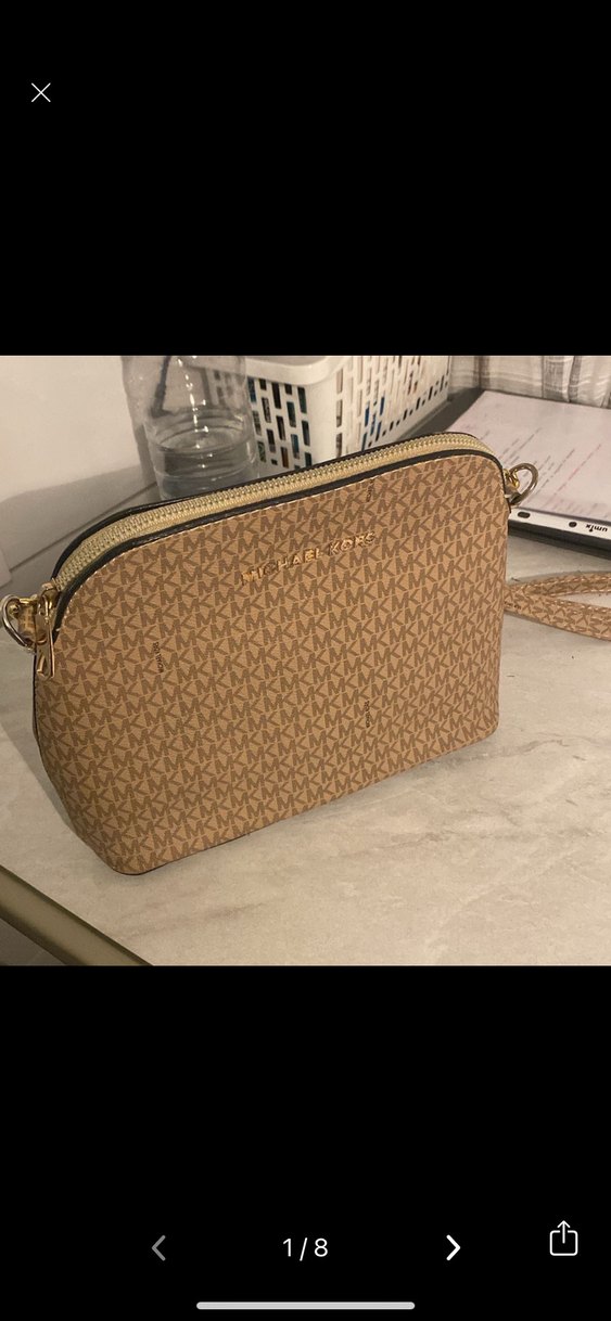 Bej deri, baskılı desenli ve fermuarlı kapanışlı çapraz çanta, Paris sokak stilini günlük kullanıma taşıyor.